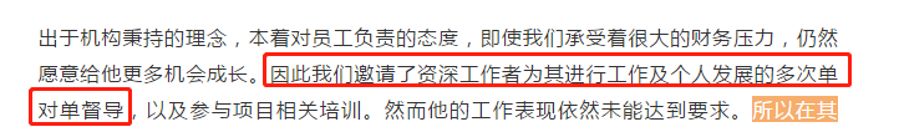 而且在去年3月到被训诫(去年12月)的这段时间,我的领导没有就我的工作情况进行过任何正式的成果评估和改进讨论。在2019年6月重签合同时,也没有针对此项工作的情况提出过任何问题。