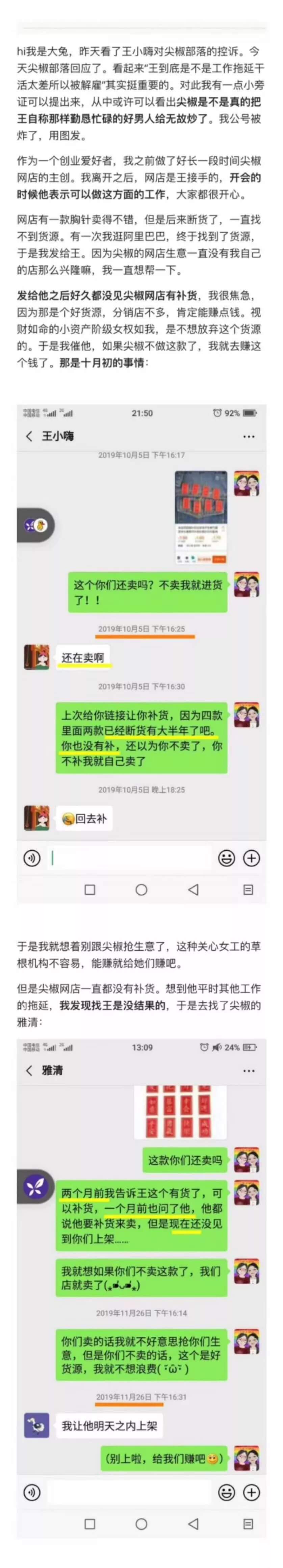 如果妳们不希望我留在尖椒部落是由于价值观,身份上的差异,大可以开诚布公地与我商谈,好聚好散,但是以见不得光的手段构陷我不能胜任工作,把我排挤出尖椒,这是我绝对不能接受的。妳们的做法,不仅践踏我作为劳动者的劳动付出,还跨越了「劳动法」规这一根本底线。