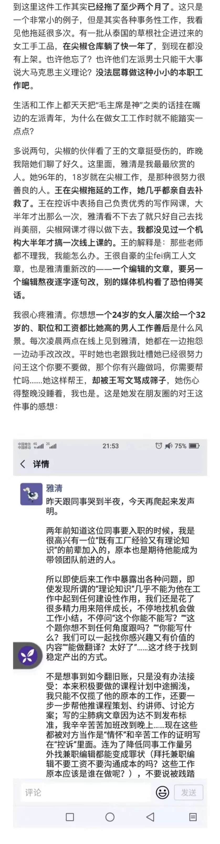 在我发出关于尖椒部落非法解雇我一事的两篇文章后,大兔和雅清,还有其她一些所谓的女权人士,在朋友圈和公众号上,发布了一系列回应。这些回应,没有答复我所质疑的任何问题,反而充斥了各种恶毒的谎言。俗话说,造谣一张嘴,辟谣跑断腿。但是,为了揭露这伙人的肮脏本质,我愿意辛苦一把,用事实回击她们的谣言。