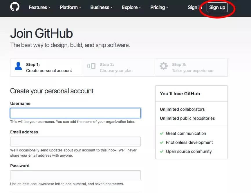 点击sign up,填入信息,注册即可。选择 username/用户名 要慎重考量,因为我们最后得到的站点主页地址:username.github.io。