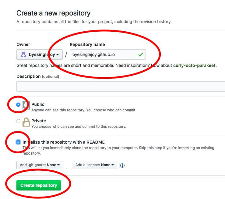 再回到首页,重新点击New Repository创建一个git库。在Repository Name写入与妳注册的username相对应的"username.github.io",勾选"Initialize this repository with a README",点击创建。