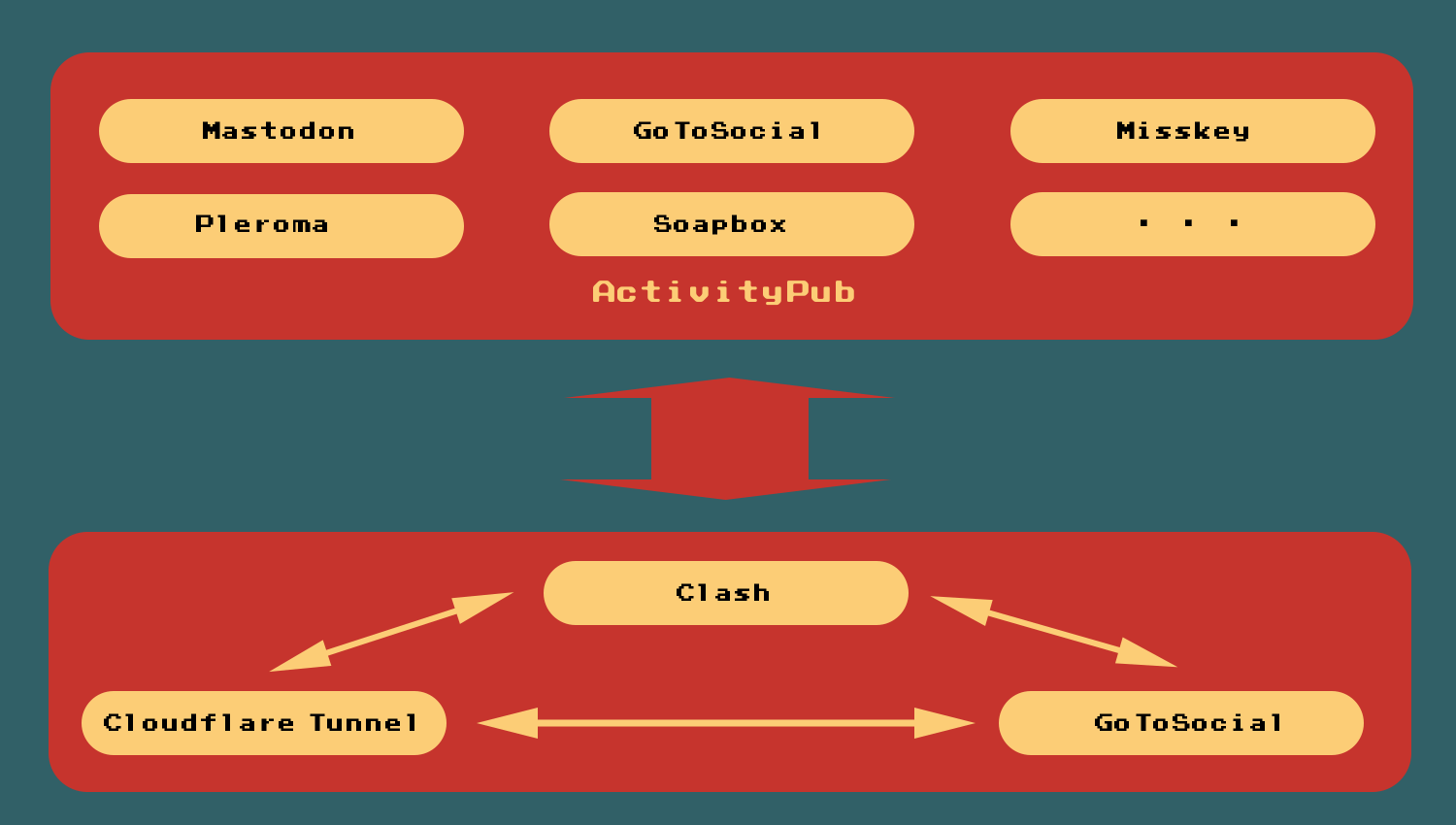 在網路受限的情況下,例如無法直接訪問 Mastodon 的官方實例 mastodon.social,我們需要依賴 Clash 作為跳板,以建立到聯邦宇宙的連接。同時,由於網路受限,無法獲得公網 IP,因此我們必須借助 Cloudflare Tunnel,將 GoToSocial 實例暴露在公共網絡上,以供訪問。