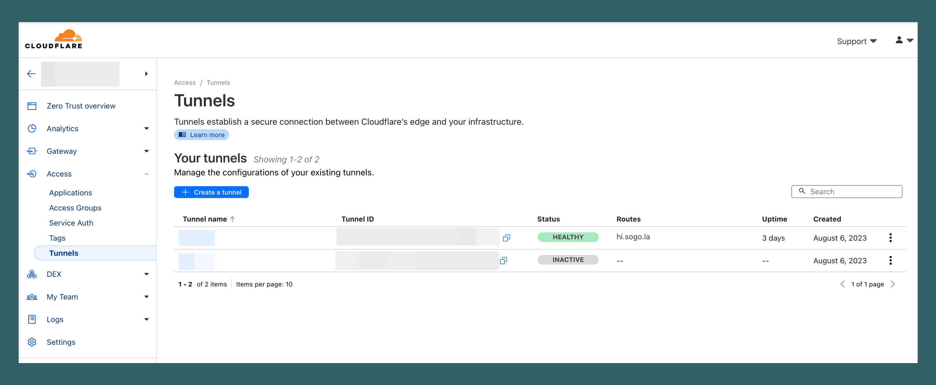 完成註冊,進入 Zero Trust 後台,選擇 Tunnels 菜單,Create a tunnel (新建一個隧道)。