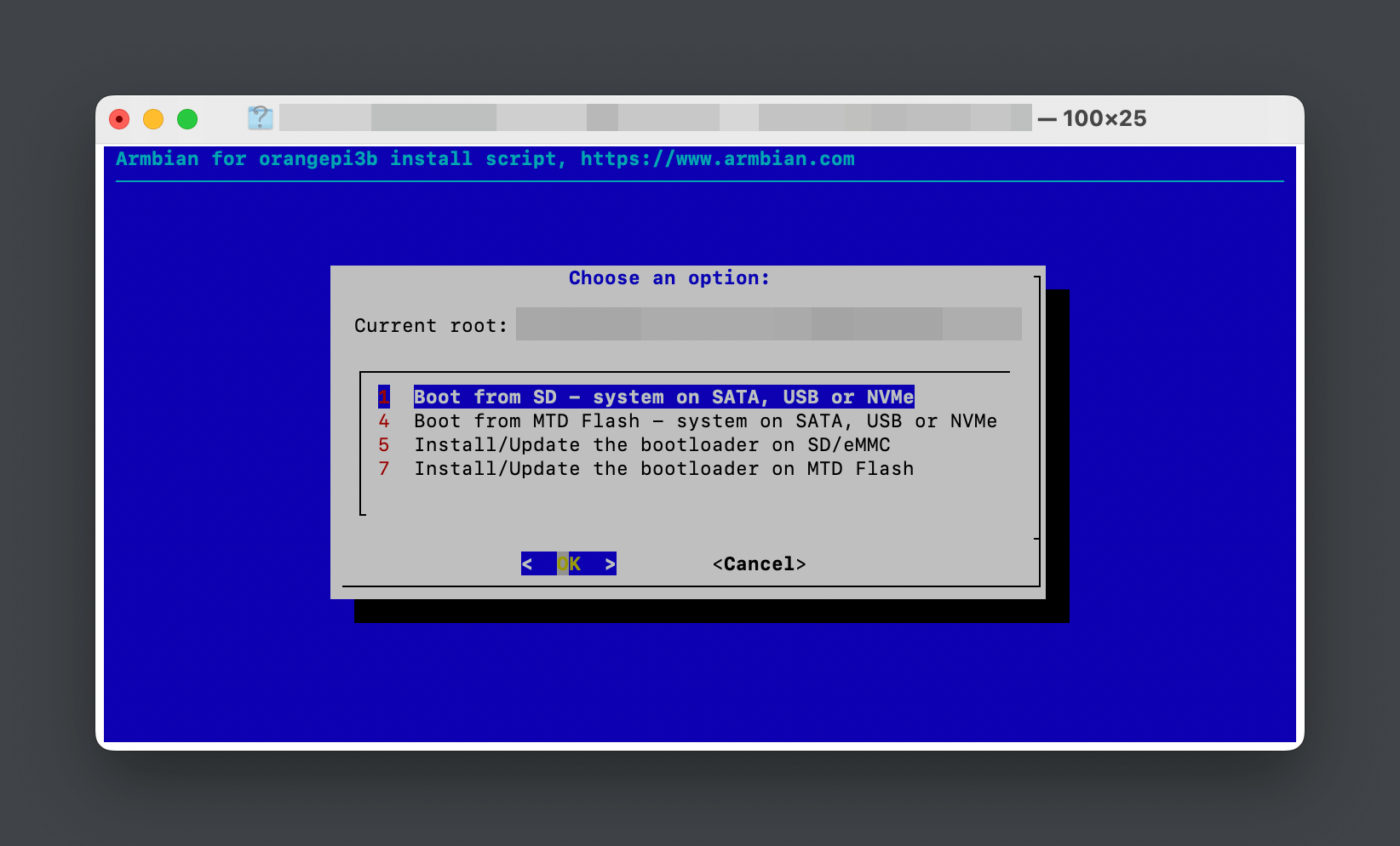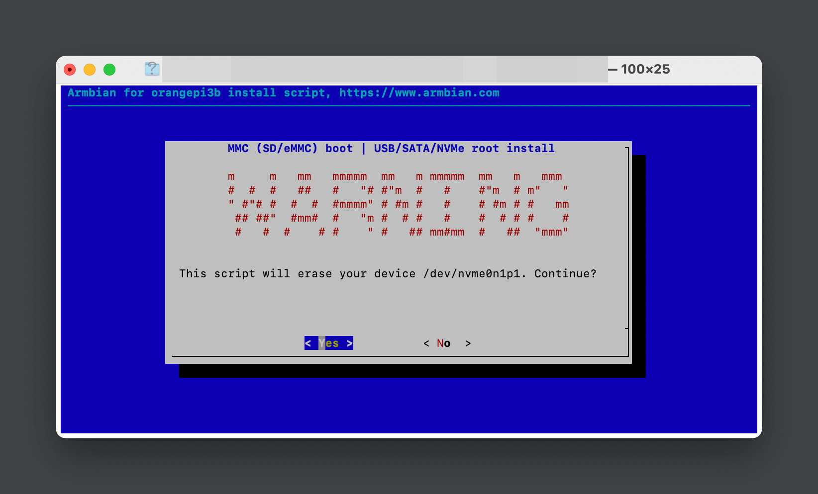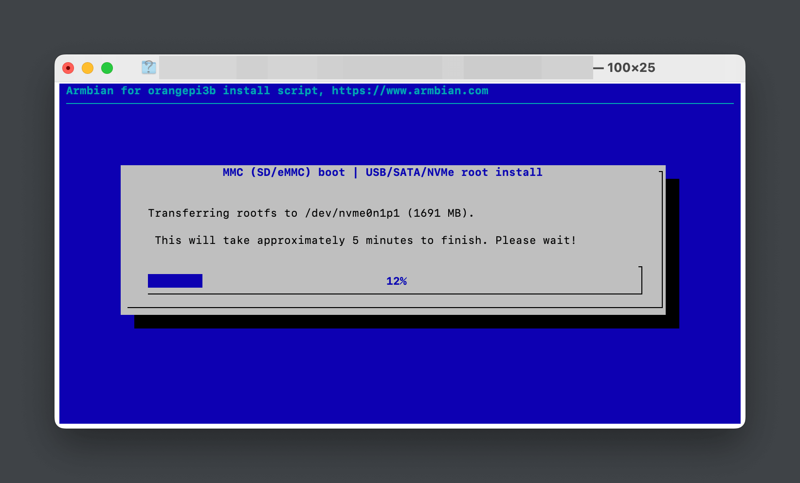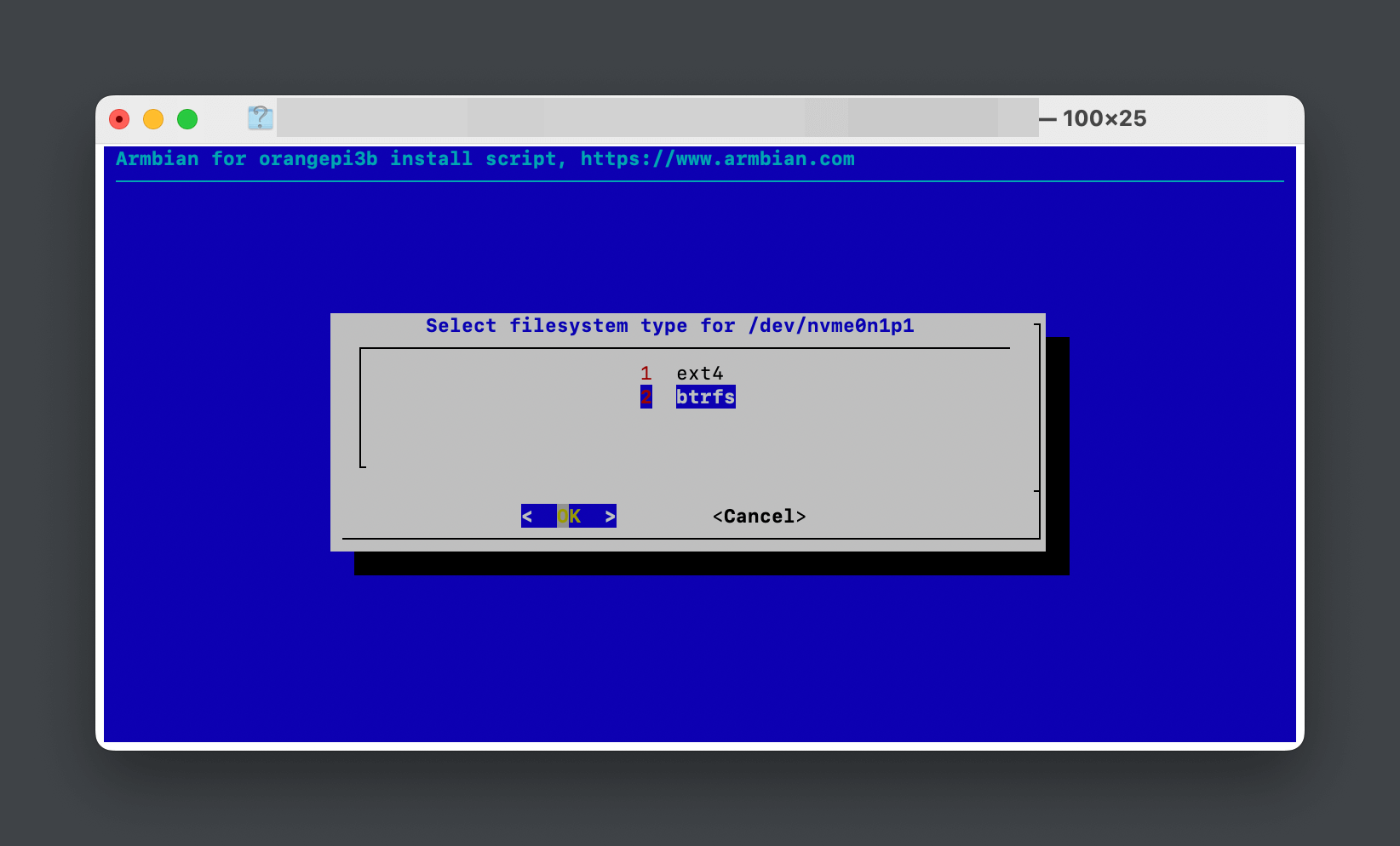 待進度格式化進度跑完後,選擇1選項。注意:香橙派的bootloader不支援btrfs格式的系統從NVMeSSD硬碟啟動,只能選擇ext4格式。