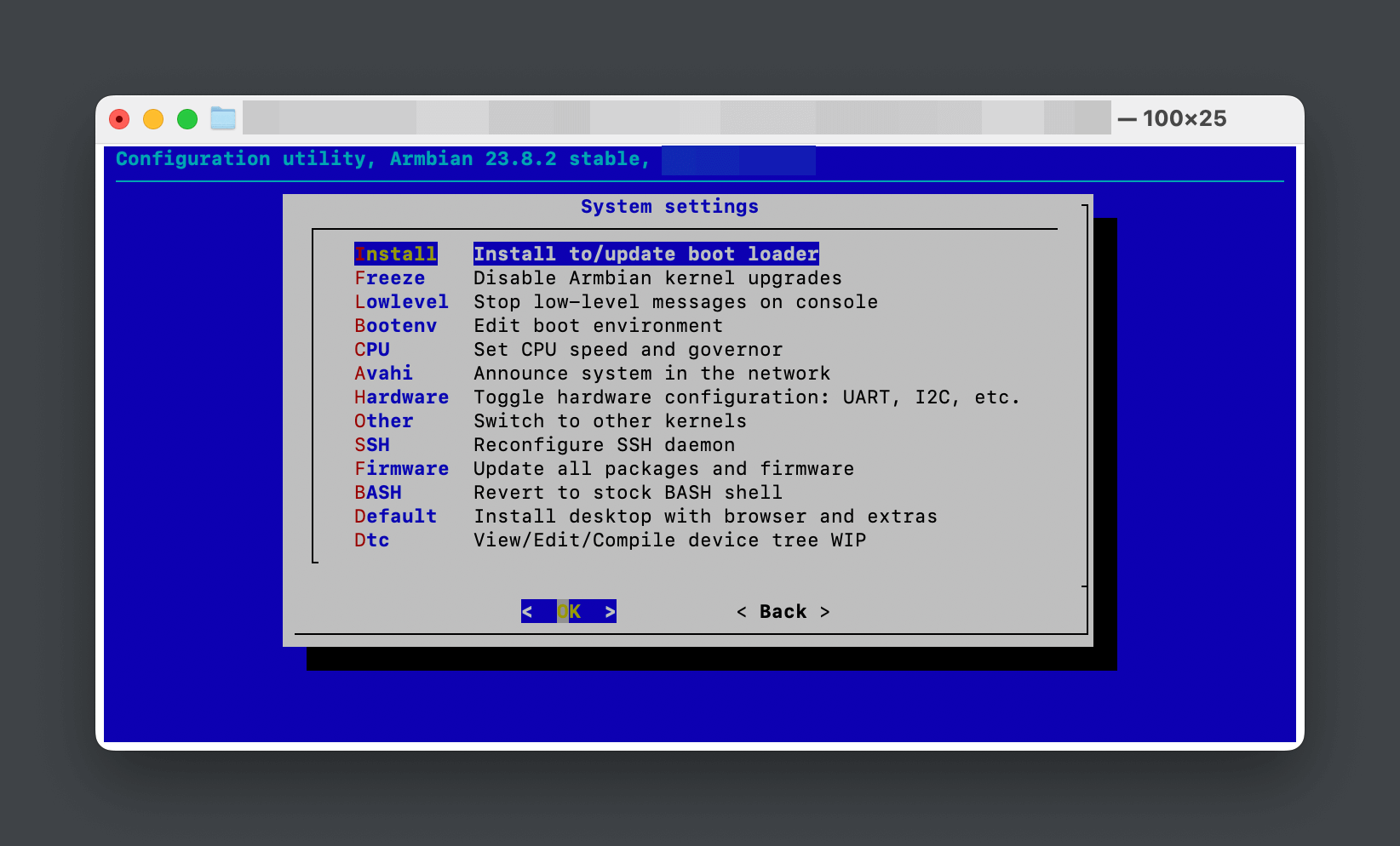 armbian的root默認密碼為1234,根據提示選擇終端類型與語言、地區等,修改默認root密碼以及創建新用戶。完成初始化設置之後,在終端鍵入命令,進入armbian的設置介面。